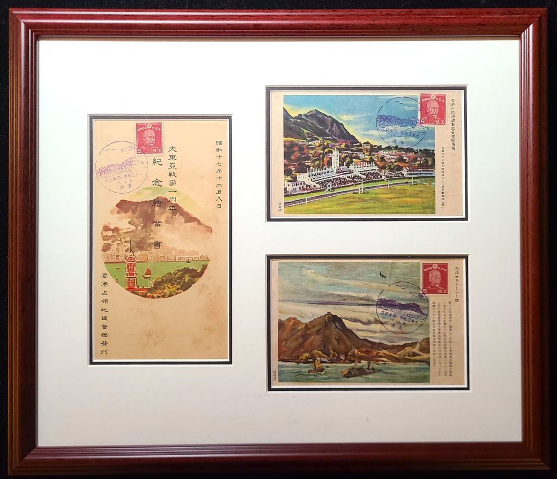 1942 a set of postcards commemorating the first anniversary of the Greater East Asia War, issued by the Governor-General's Office of the Occupied Territory of Hong Kong. Each postcard and the envelope are affixed with a Japanese 5-sen stamp and bear a commemorative postmark dated December 8, 17th, featuring a Hong Kong Island image. This precious set of postcards is framed