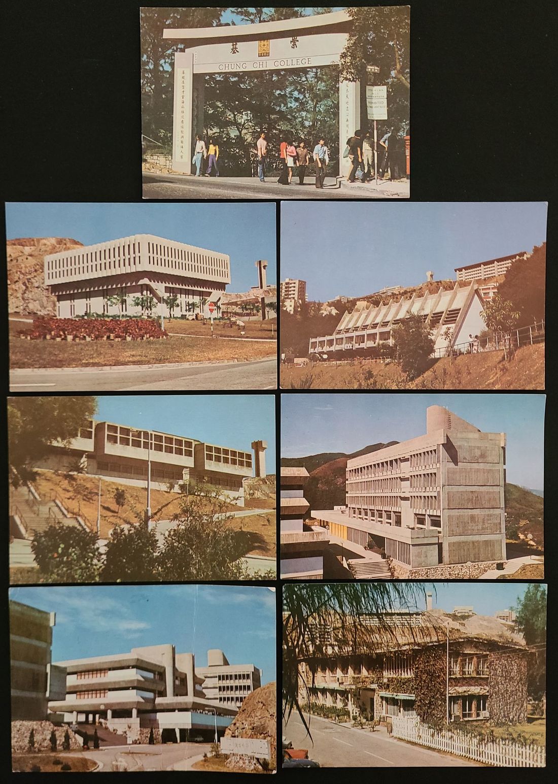1970年代香港中文大學明信片七枚, 當中景物包括崇基學院門樓, 大學圖書館, 中國文化研究所, 聯合書院及眾志堂等. 明信片由澳門印刷.