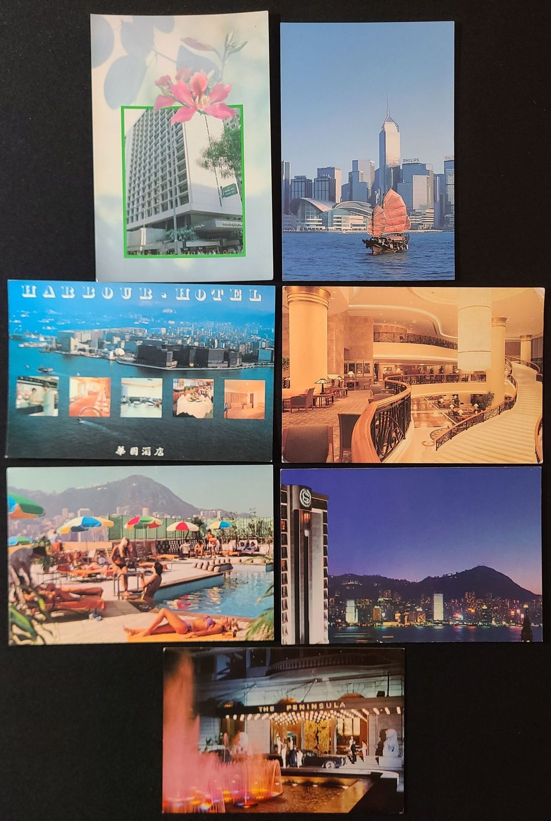 1980-1990年代香港各大酒店宣傳明信片共七枚, 包括The Peninsula, Renaissance Harbour View Hotel, Holiday Inn Hong Kong Golden Mile H. K., Harbour Holel, Harbour Plaza, 及Sheraton-Hong Kong Hotel.
