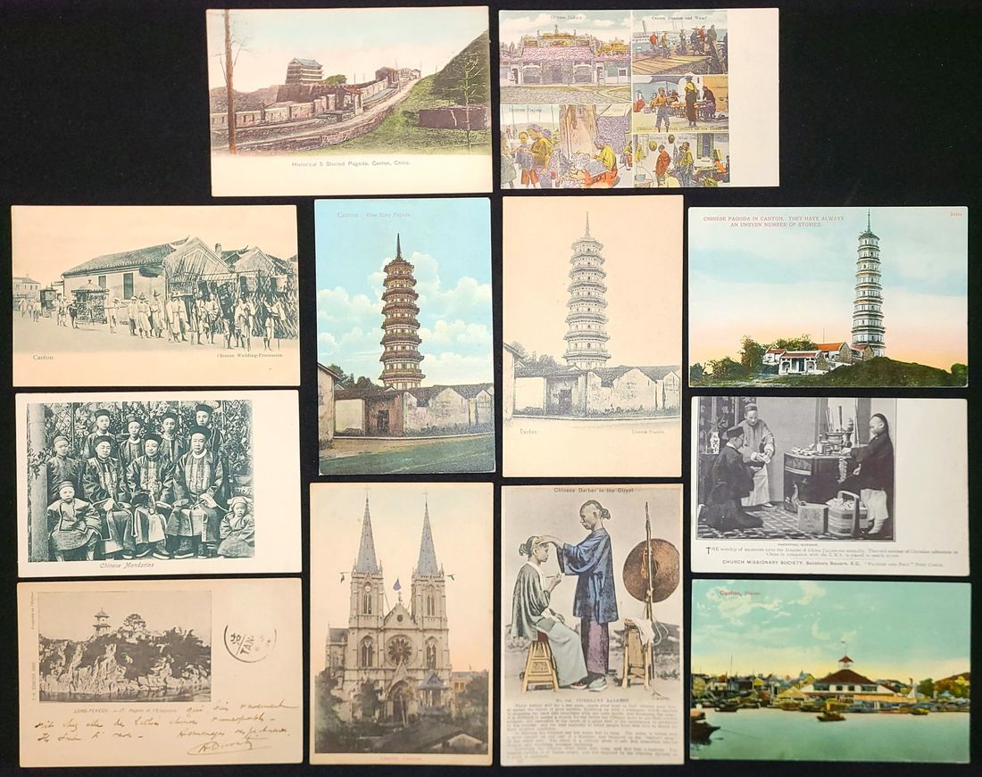 1900-1910年代明信片一組十二枚, 內容以廣州風物為主, 包括: 粵海關驗貨廠, 六榕寺花塔, 聖心大教堂, 鎮海摟, 迎親隊伍及街頭理髮等等. 均狀態良好.