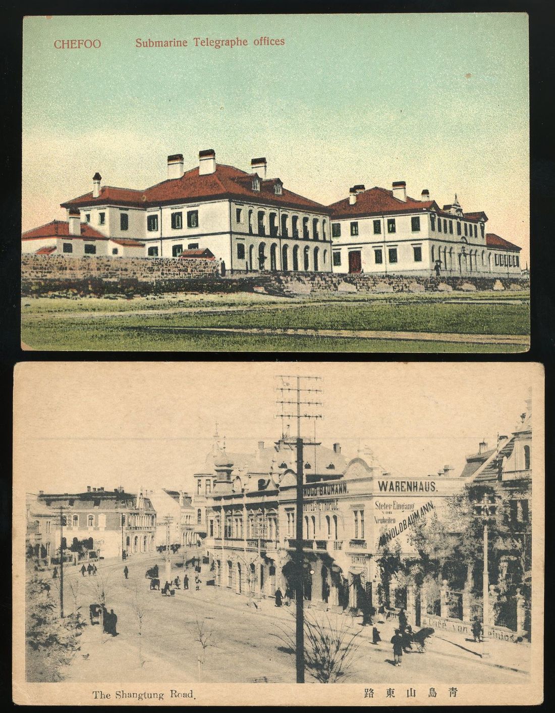 1900-1910年代青島山東路及山東烟台海底電報局大樓明信片各一枚,
