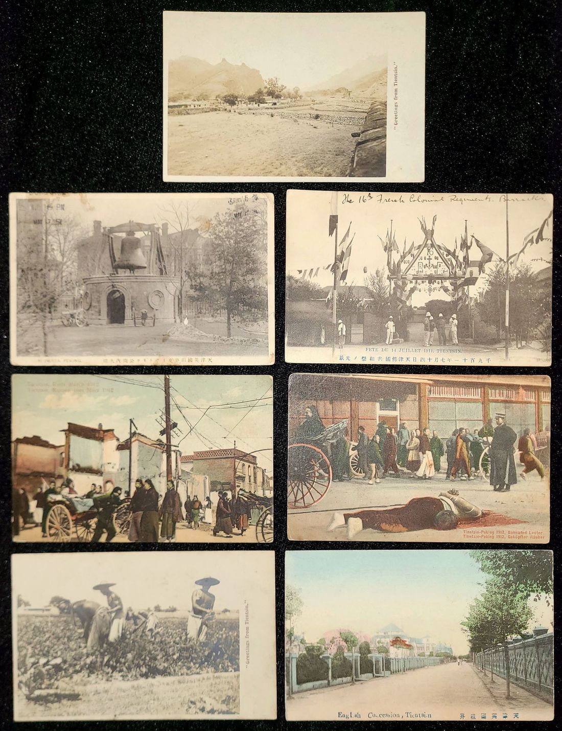1900-1910年代天津明信片七枚; 景物包括1912年天津暴亂, 英國租界, 1911年7月14日天津法國人國慶日, 天津農夫及天津郊外長城等等.