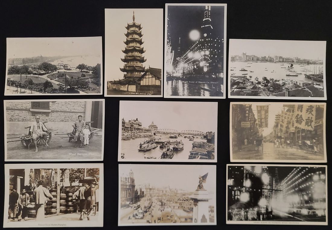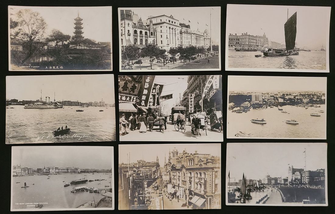 1920s-1930s thirty-five real photo postcards feature photographic images of Shanghai's Huangpu River and Bund, with other scenes including the Suzhou River, Nanjing Road, Fuzhou Road, and a wheelbarrow. The images are rich in content and in excellent condition.