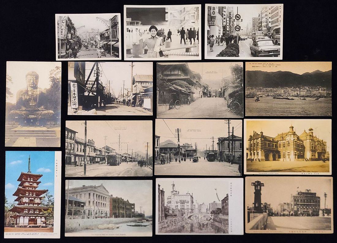 1910s-1970s group of 14 Japanese postcards and photos features scenes, including 1970s Ginza, HSBC Bank in Nagasaki, Tokyo Shinbashi Station, and the Isesakicho street in Yokohama.