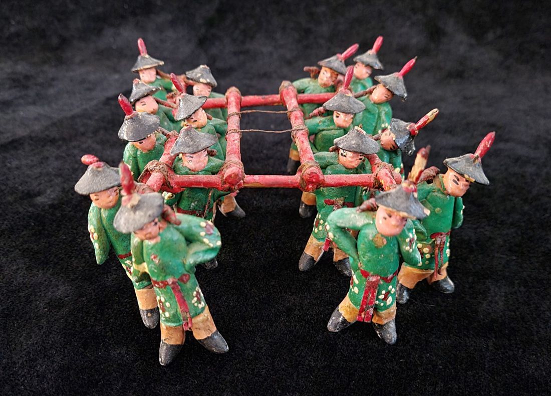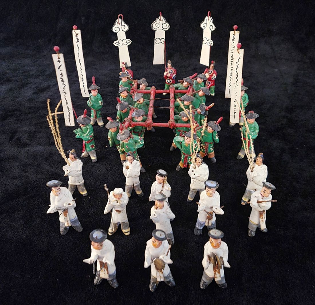 1900-1910 少見清末民初時代中國葬儀行列模型, 全組共36個不同小型人物, 均身長約5cm, 手中各持不同樂器, 或白幡, 或抬木架 (上以載棺槨之用), 各司其職. 各人物以黏土手造, 敷以不同色彩, 形神俱似, 排列起來, 只見莊嚴無比. 個別人物有少許殘缺, 但這組過百年之民間手工藝品, 仍屬非凡的收藏品.