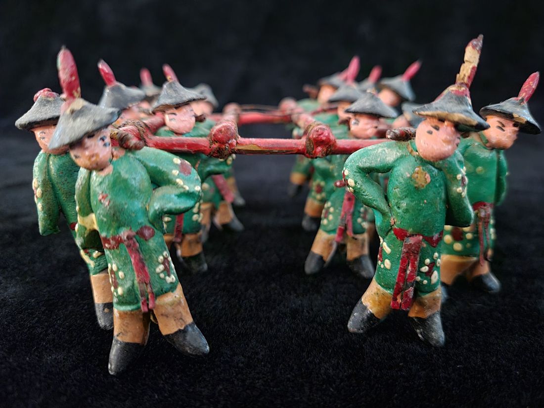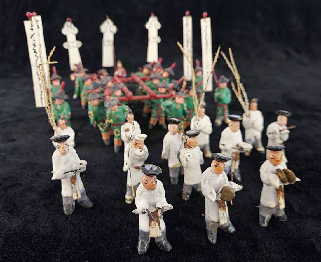 1900s-1910s a group of rare model of a Chinese funeral procession from the late Qing Dynasty and early Republican era features 36 miniature figures, each approximately 5cm tall. Each holds a musical instrument, a white banner, or a wooden frame (used to carry a coffin), each performing a specific function. Each figure is handcrafted from clay and painted in a variety of colors, each resembling a true-to-life figure. When arranged, the procession creates an imposing and majestic scene. While some individual figures may be slightly damaged, this over-a-century folk art piece remains a truly exceptional collectible.