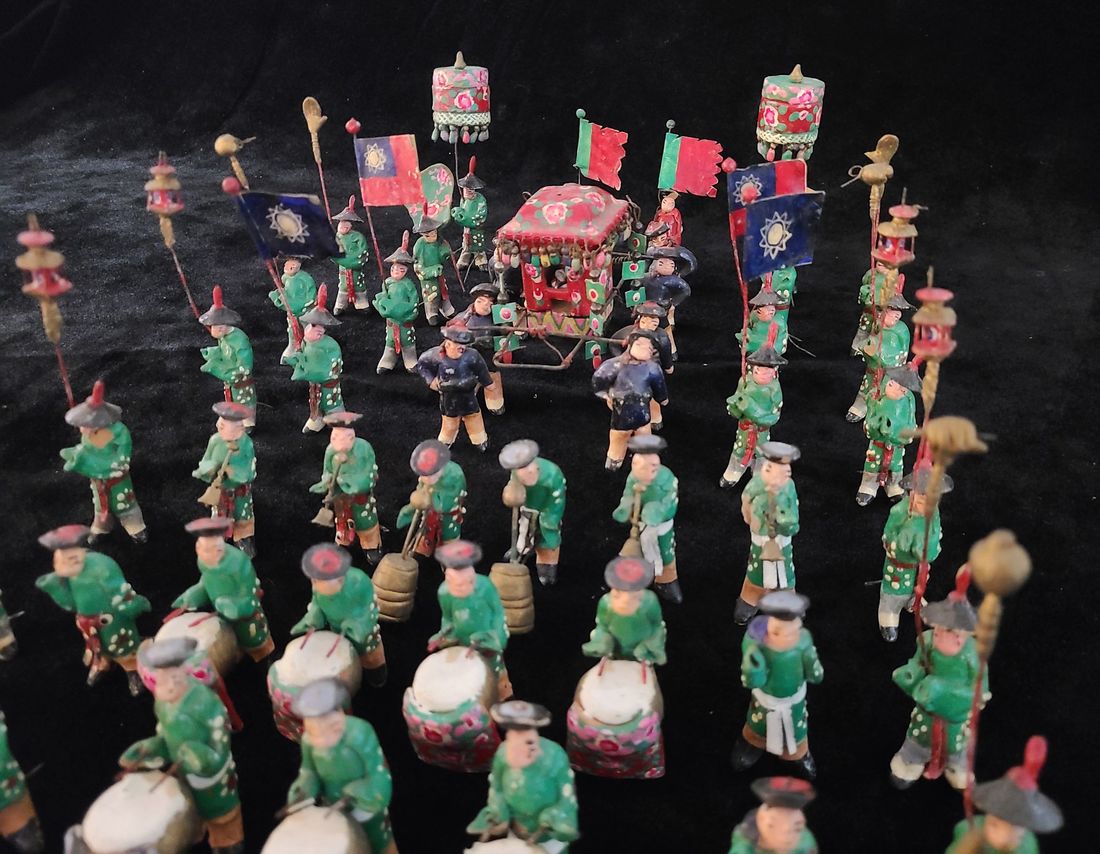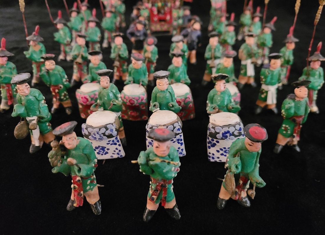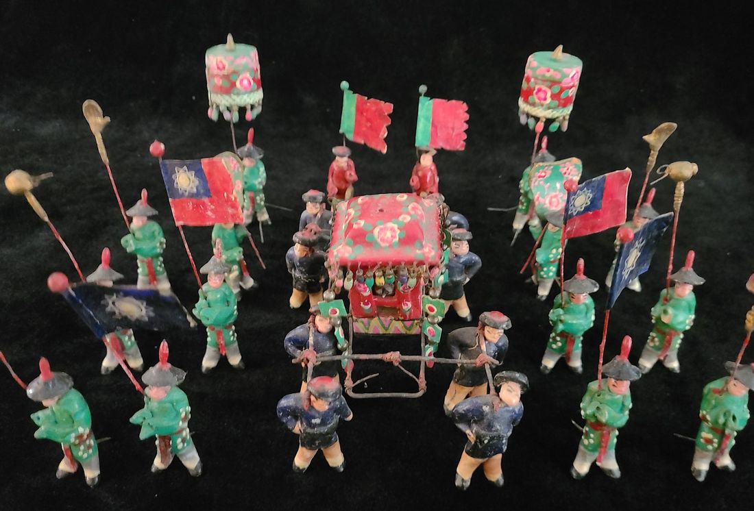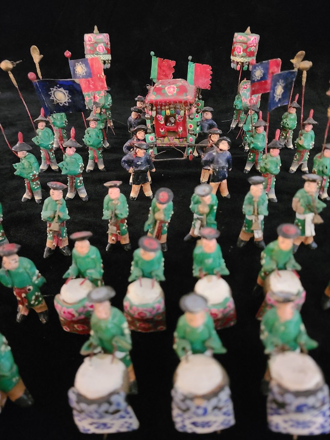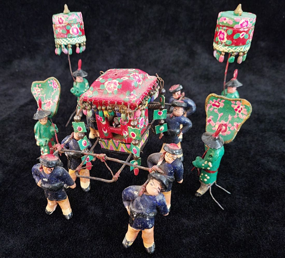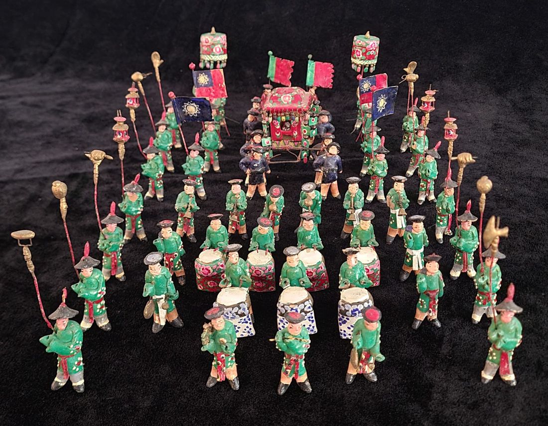 1900-1910 少見清末民初時代中國婚儀行列模型, 全組共52個不同小型人物, 全都身長約5cm, 手持各種不同樂器, 或旗幟, 或羅傘. 或抬花轎等, 各司其職. 人物及器物全以黏土手造, 敷以不同色彩, 斑麗奪目, 排列起來, 盡顯其架勢. 個別人物有少許殘缺, 但這組過百年之民間手工藝品, 仍屬罕見的收藏品.