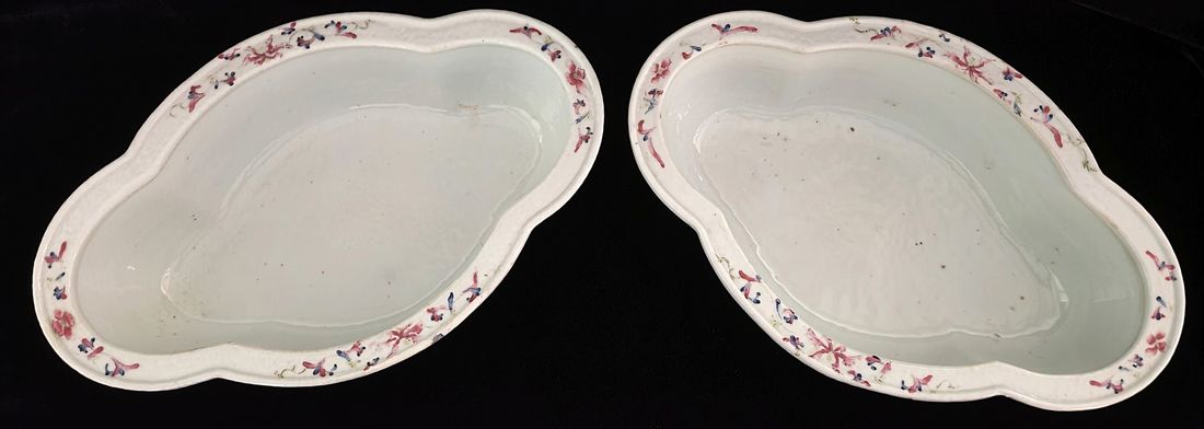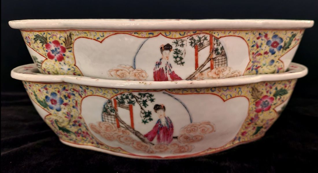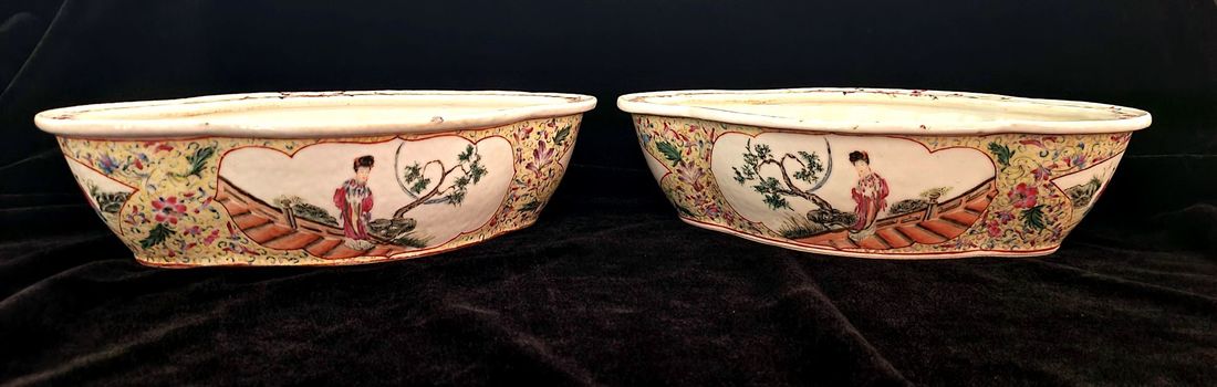 民國時期白瓷粉彩人物纏花海棠水仙盤一對, 共繪形態各異古裝仕女四人, 及戲童亦是四人, 人物之外纏花亦極為精妙, 設色典麗. 瓷胎亮白, 而底款之仿章 "乾隆年製" 乃民國時期常見. 尺寸 (两盤均相同): 高7cm, 盤口寬:17.3 x 27.3cm