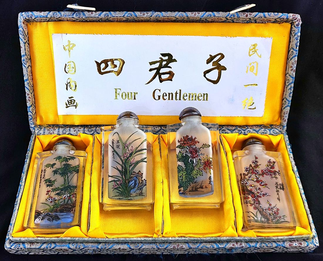 A set of four Chinese snuff bottles, themed "Four Gentlemen" (plum, orchid, chrysanthemum, bamboo), all hand-painted inside, each with lid: 4.2 x 8.2 x 1.7cm. Comes with original brocade box.