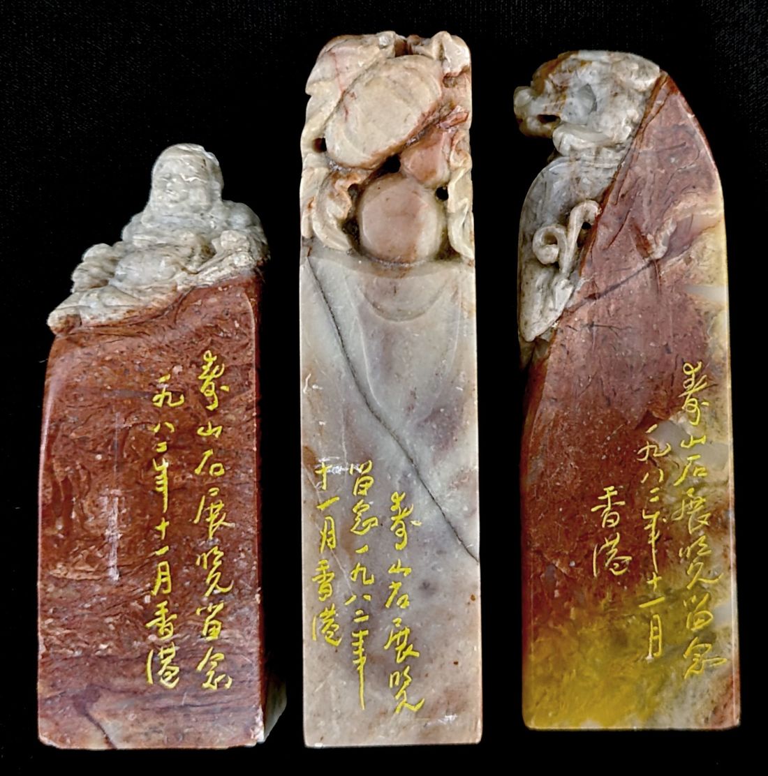 1982年香港壽山石展覽會紀念印章 (未刻)三顆, 印章頂部分別彫有佛像, 端獅及瓜果. 尺寸: 7.5cm高 及6.5cm高