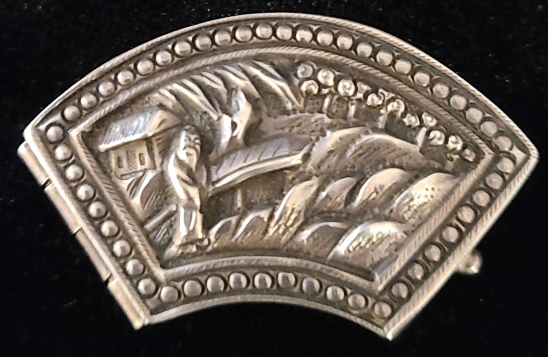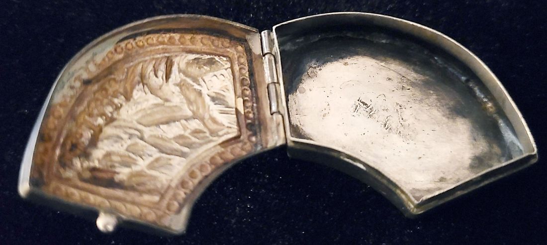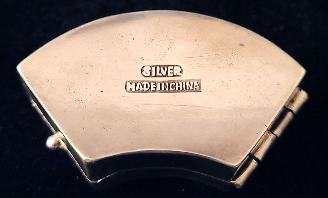 1900 A small, fan-shaped silver snuff box from the late Qing Dynasty. The box features an image of an elderly Chinese man strolling by a lake, and the words "Silver/Made in China" are inscribed on the bottom. Dimensions: 2.3 x 4.1 x 1cm