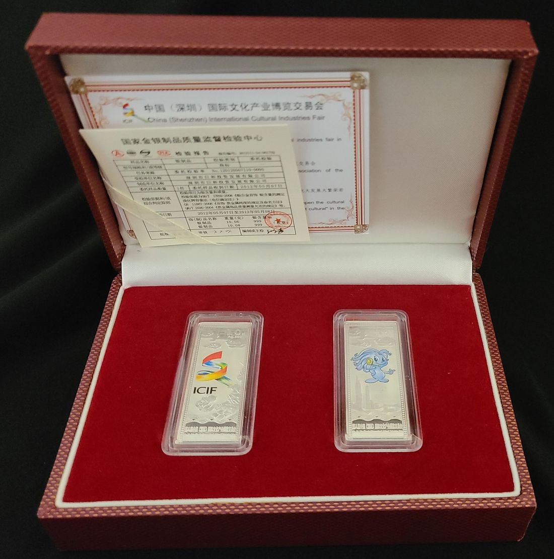 2012年第八屆中國(深圳) 國際文化產業博覽交易會 (ICIF)的紀念銀牌两枚, 各重10g, 銀含量999. 帶原包裝盒及証書