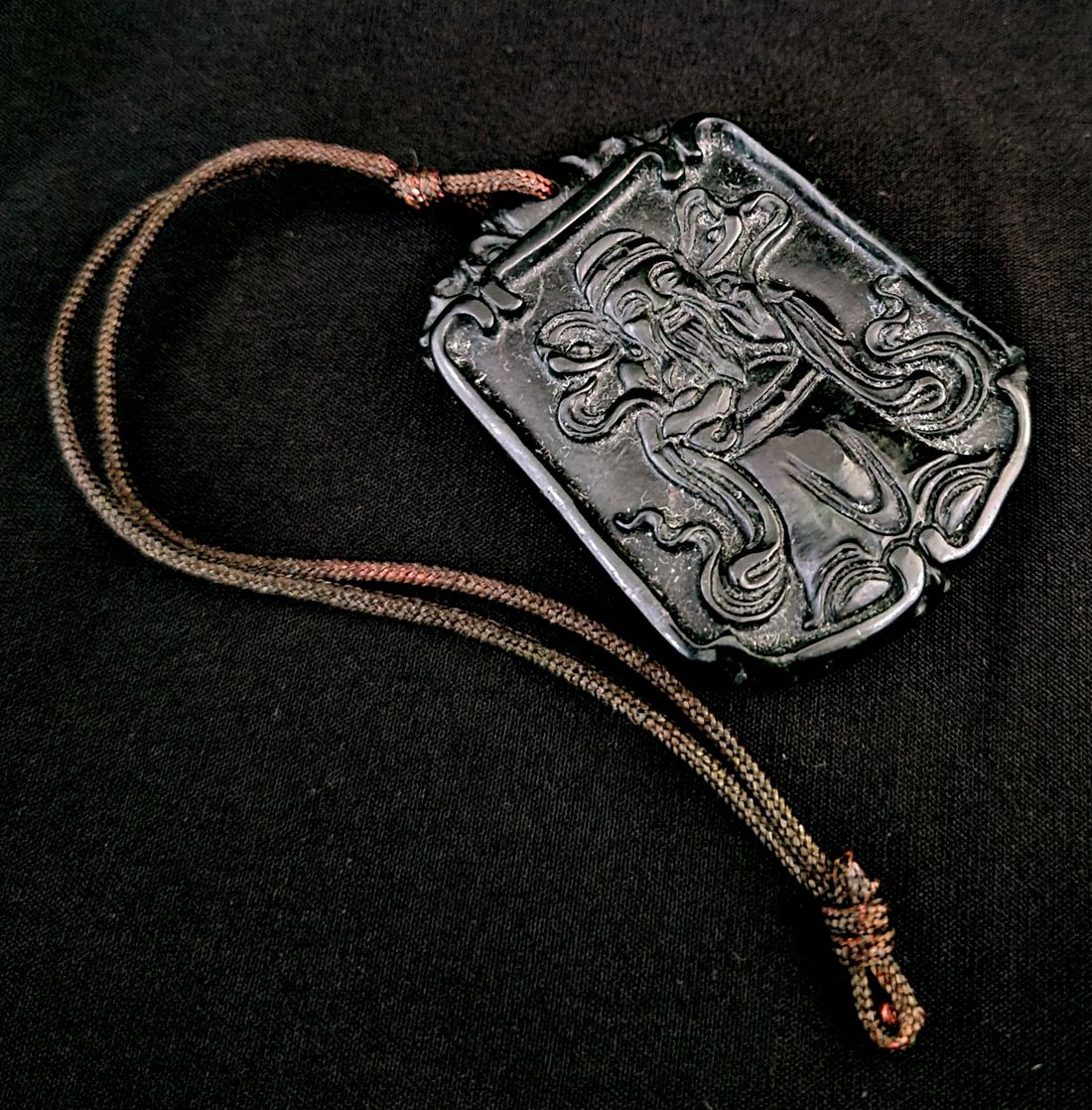 中國黑玉吊牌, 牌內彫財神一尊. 尺寸: 3.5x5x0.5cm