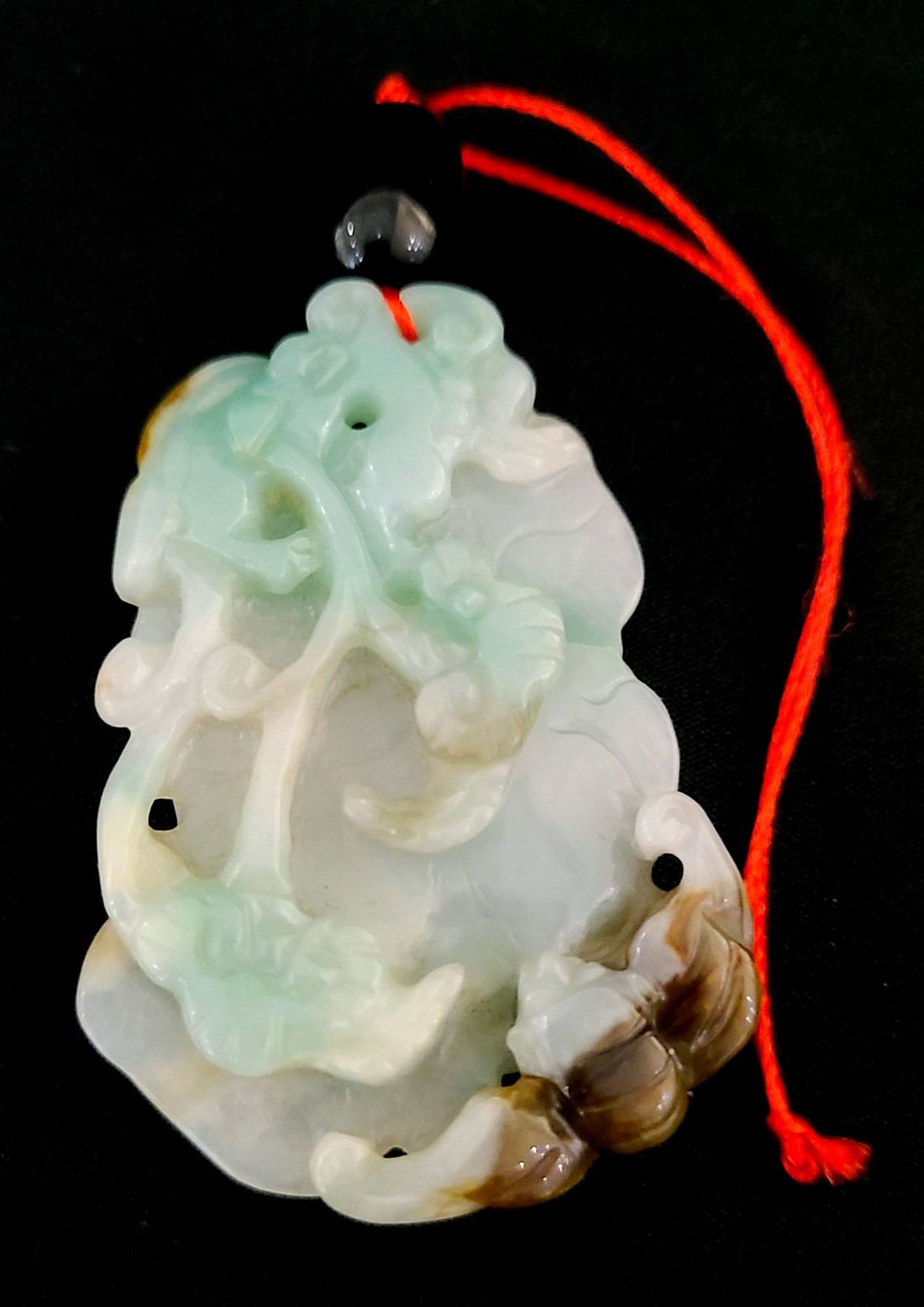 Fortune Brings Blossoms Green Jade Pendant with lotus leaf shape engraved on the back. Size: approx. 3x5cm