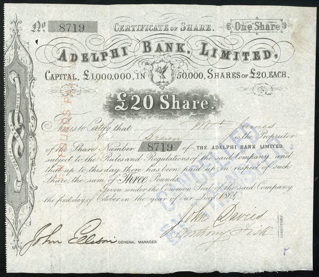 1864 one share of Adelphi Bank, Limited, UK.Capital of £1 million and 50,000 shares issued, each worth £20. Stock number: 8719. "Cancelled By Transfer" hand stamp on the stock.