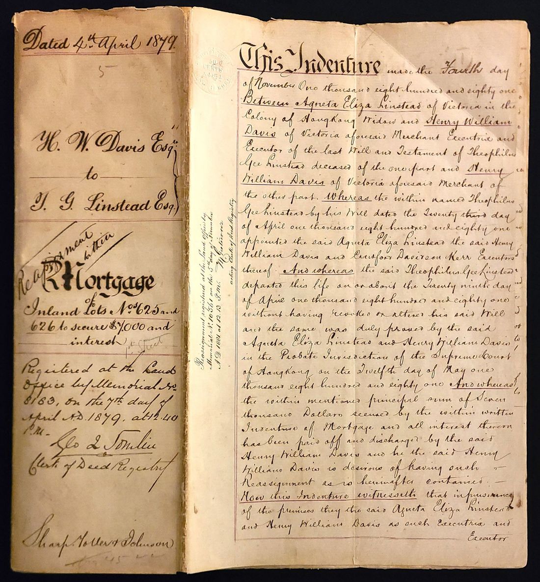 1879 a mortgage agreement from the early days of Hong Kong. The property is located on Western Street in Sai Ying Pun, Hong Kong. The mortgage amount is HK$7,000 and is stamped with a four-dollar stamp. A rare artifact from early Hong Kong.