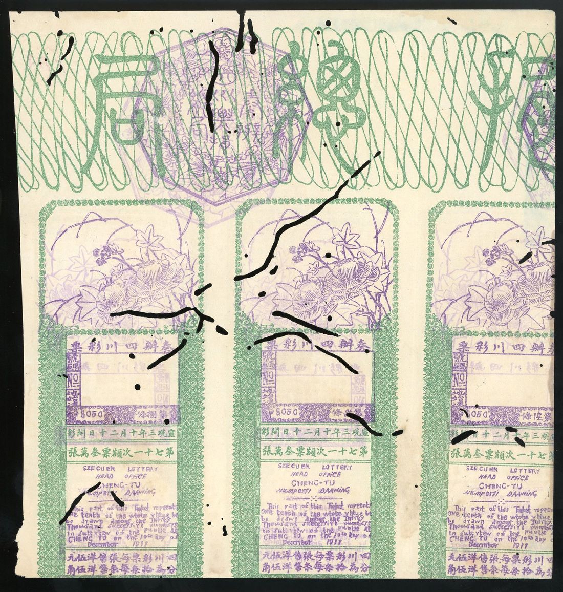 1911年雙色印刷四川彩票, 未切三枚相連, 有一些蟲蛀的洞孔.