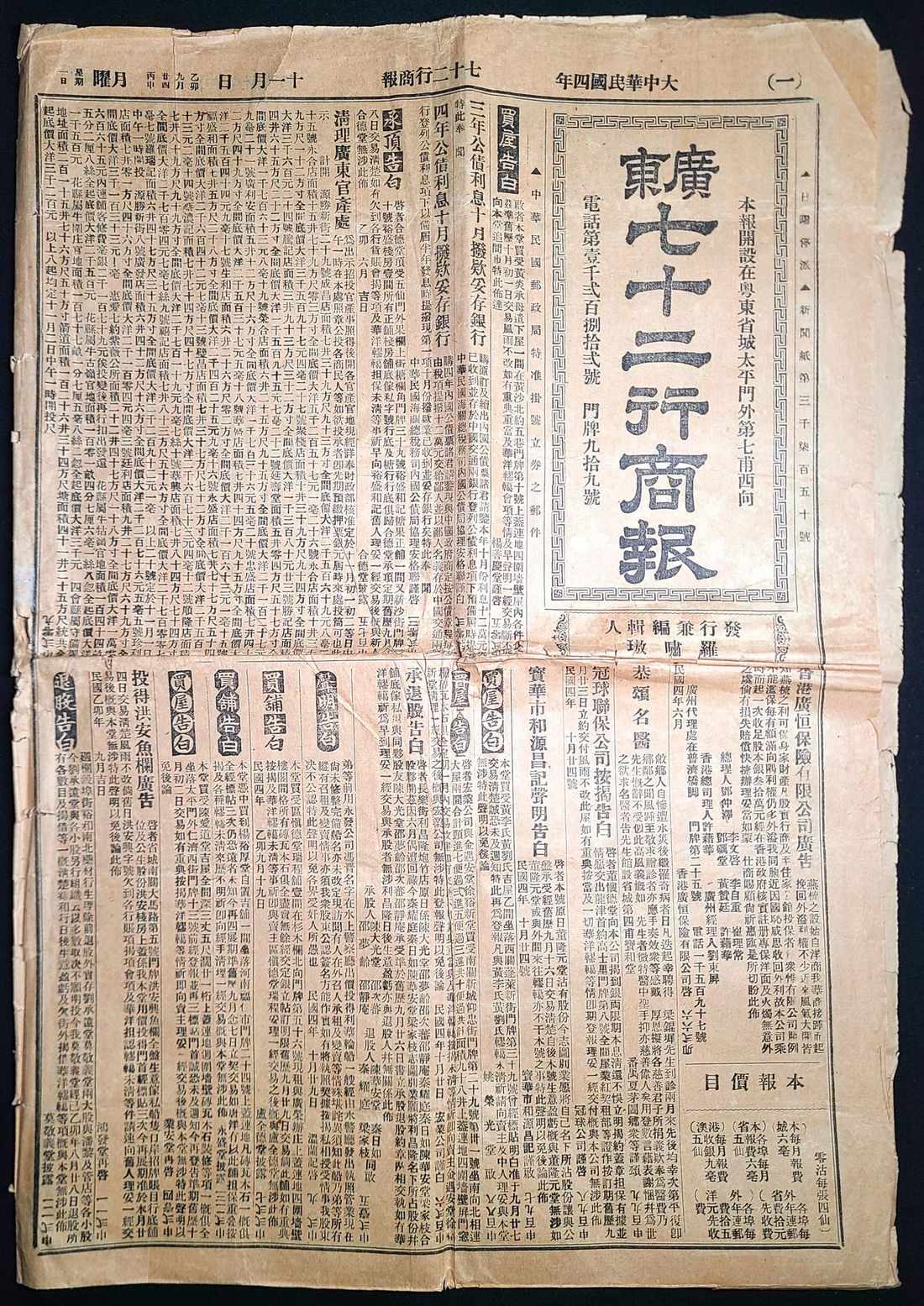 1915年 (民國四年)十一月一日 "廣東七十二行商報", 報中除了報導廣東 (以廣州為主)的商事及地産買賣外, 亦有小說及中外要聞, 今期主要登載袁世凱於當年十二月宣布復辟帝制之報導.