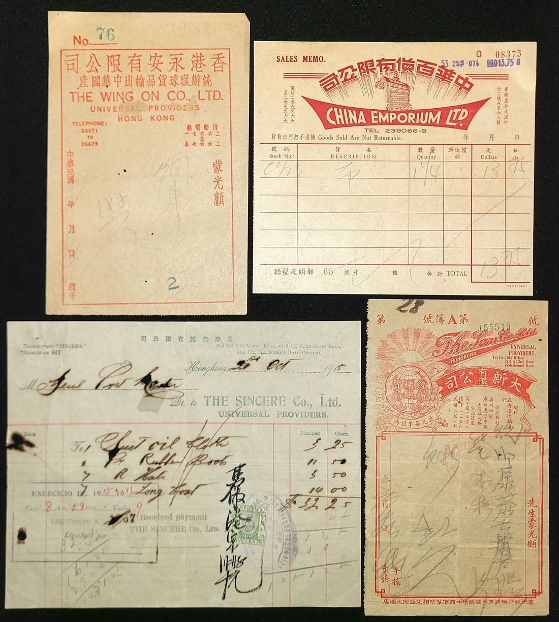 1915-1950s old receipt from each of Hong Kong's four largest and famous department stores, each with a photocopy of the food served. Included "Sincere", Wing On", "The Sun" and "China Emporium". This is a rare opportunity to collect receipts from all four major department stores in one time.