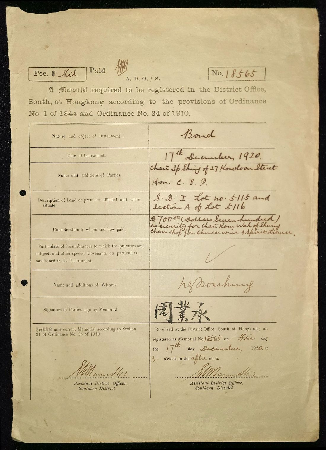 1920 a sheet of the Memorandum of Land Registry for the Southern District of Hong Kong Island, No. 18565, free of charge. Signed by the Assistant District Officer of the Southern District.