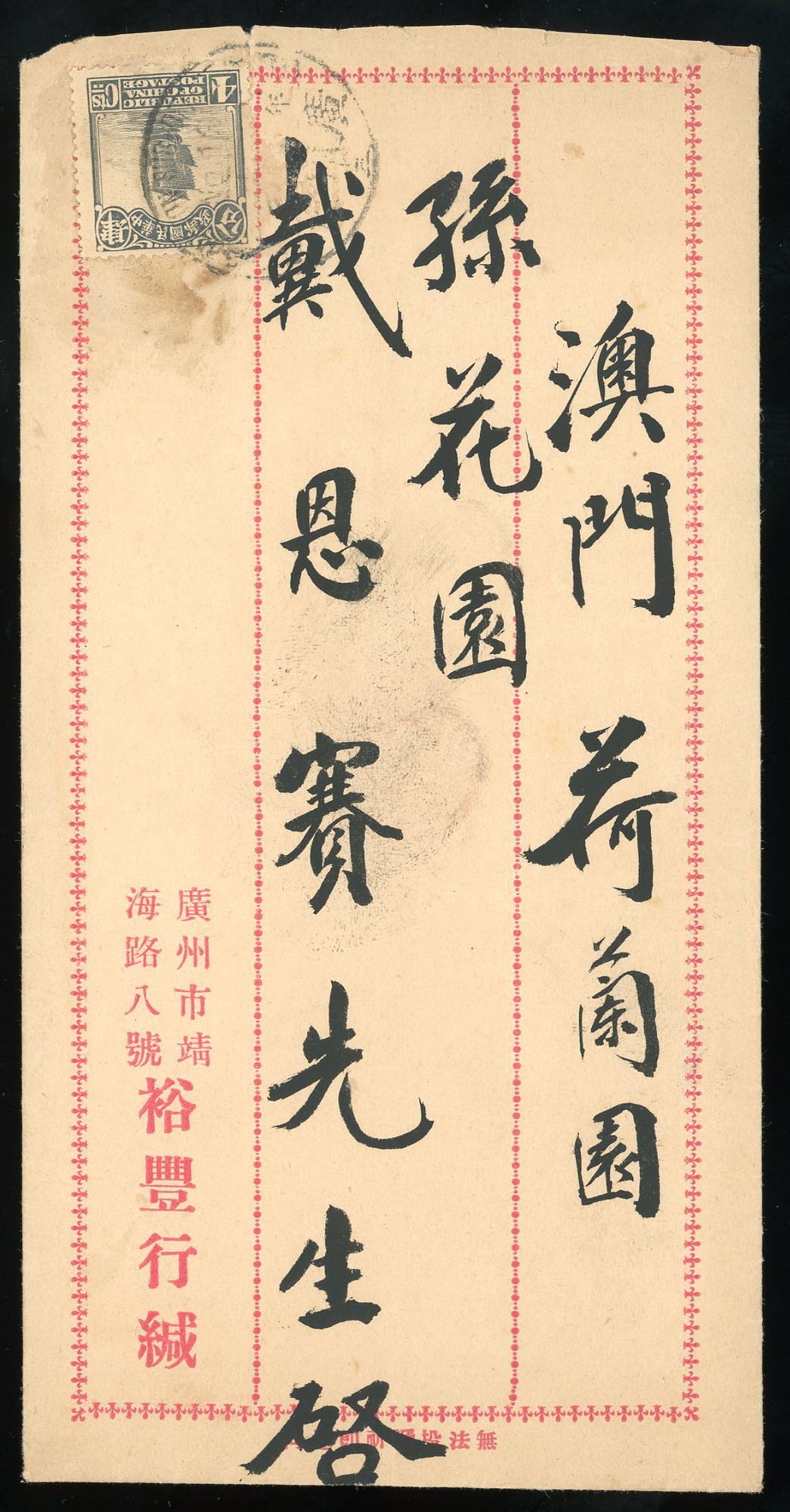 1925年廣州寄澳門孫花園 (今中山紀念館) 中式信封一件, 收信人戴恩賽先生. 註: 戴恩賽博士 (1892年5月6日—1955年1月16日), 孫中山先主之女婿, 孫中山女兒孫婉之丈夫, 以及孫中山遺囑證明人之一.
