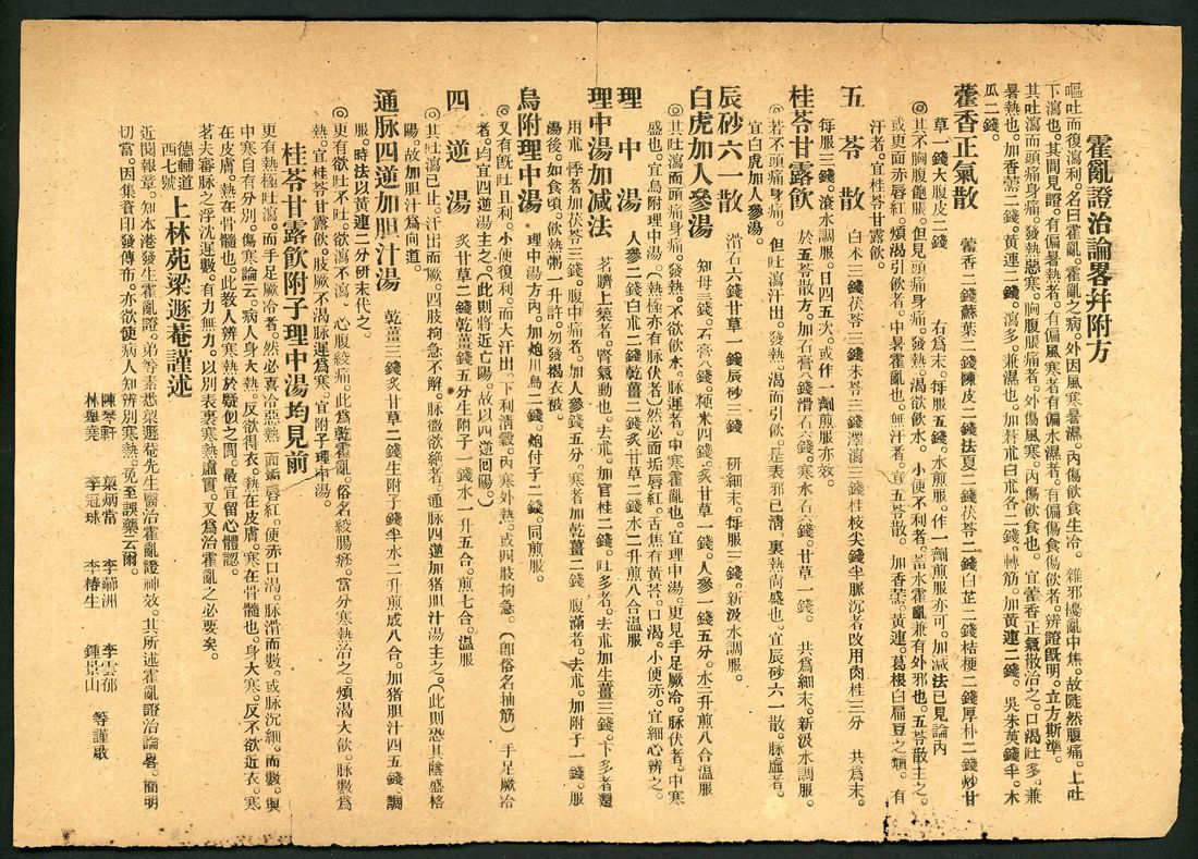 1930s a group of Hong Kong scholars raised funds to print a leaflet titled "A Brief Discussion on the Treatment of Cholera with Prescriptions". It is known that there were cholera outbreaks in Hong Kong in 1937 and 1940. This leaflet should be a testimony to that period.