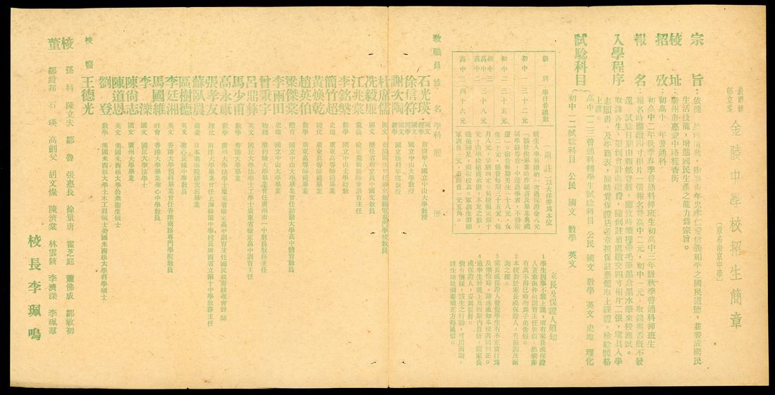 1930s the Guangzhou Jinling Middle School enrollment brochure. The school was originally named Nanjing Middle School and was renamed Private Jinling Middle School in 1935. The school directors included celebrities Sun Ke, Chen Lifu, Li Jishen and painter Gao Jianfu.
