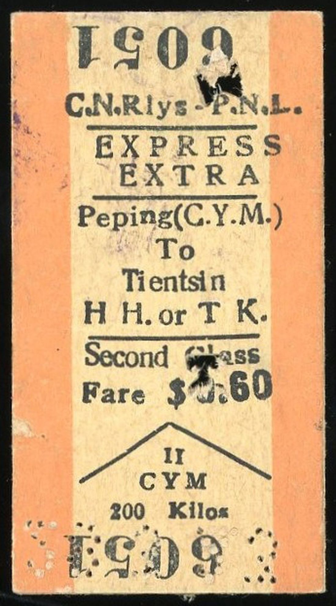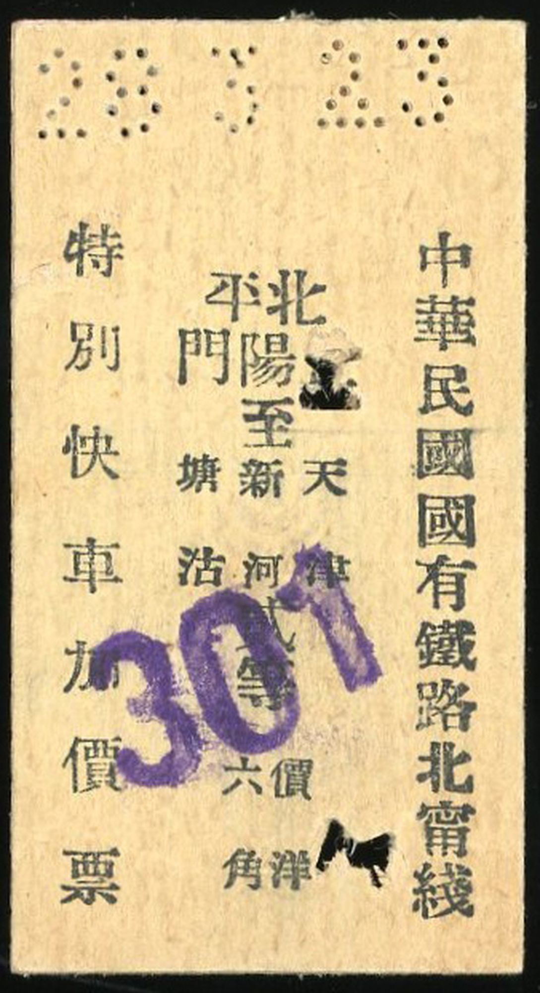 1930s-1940s a special express second-class fare ticket from the Beining Line of the Republic of China, running from Zhengyangmen in Peking to Tanggu in Tianjin, costing 60 cents. Serial number 6051. In excellent condition, a rare find.