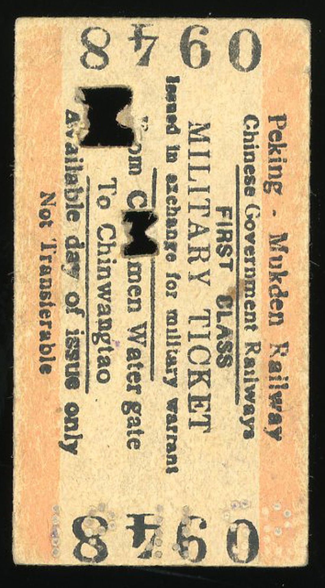 1930s-1940s First-class military passenger ticket, number 0948, for the Beijing-Fengtian Railway, directly under the Ministry of Communications of the Republic of China, from Qianmen Water Gate in Beijing to Qinhuangdao. Excellently preserved and rare.