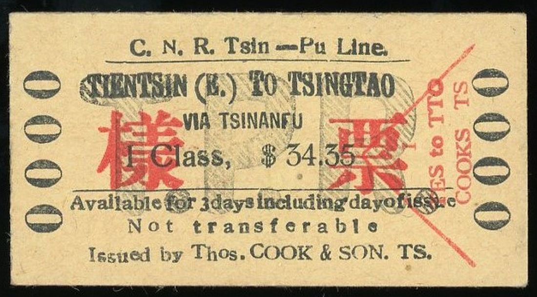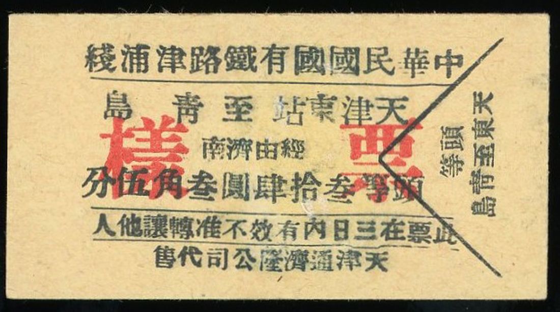 1930-1940年代中華民國國有鐵路津浦線, 天津東站至青島火車頭等樣票, 編号0000, 保存良好, 少見品.