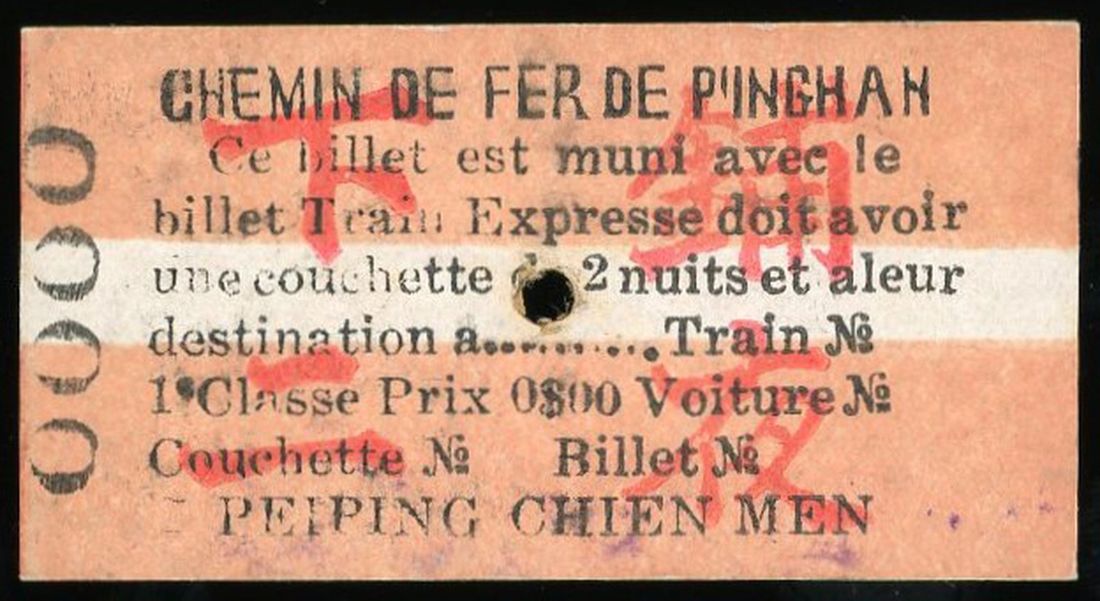 1930s-1940s Pinghan Railway Administration bed space sample ticket, printed with "two night for lower bed" and "Specimen", numbered 0000, in excellent condition, a rare item.