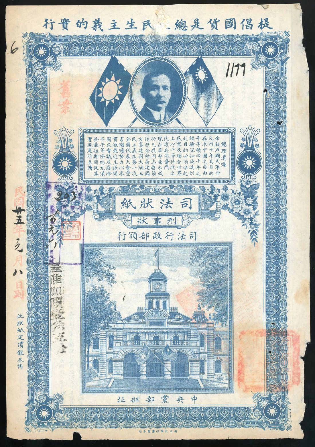 1936 (民國二十五年) 由當年司法行政部頒行 "刑事狀/ 司法狀紙". 上印有中央黨部建築圖畫及蓋有官章.