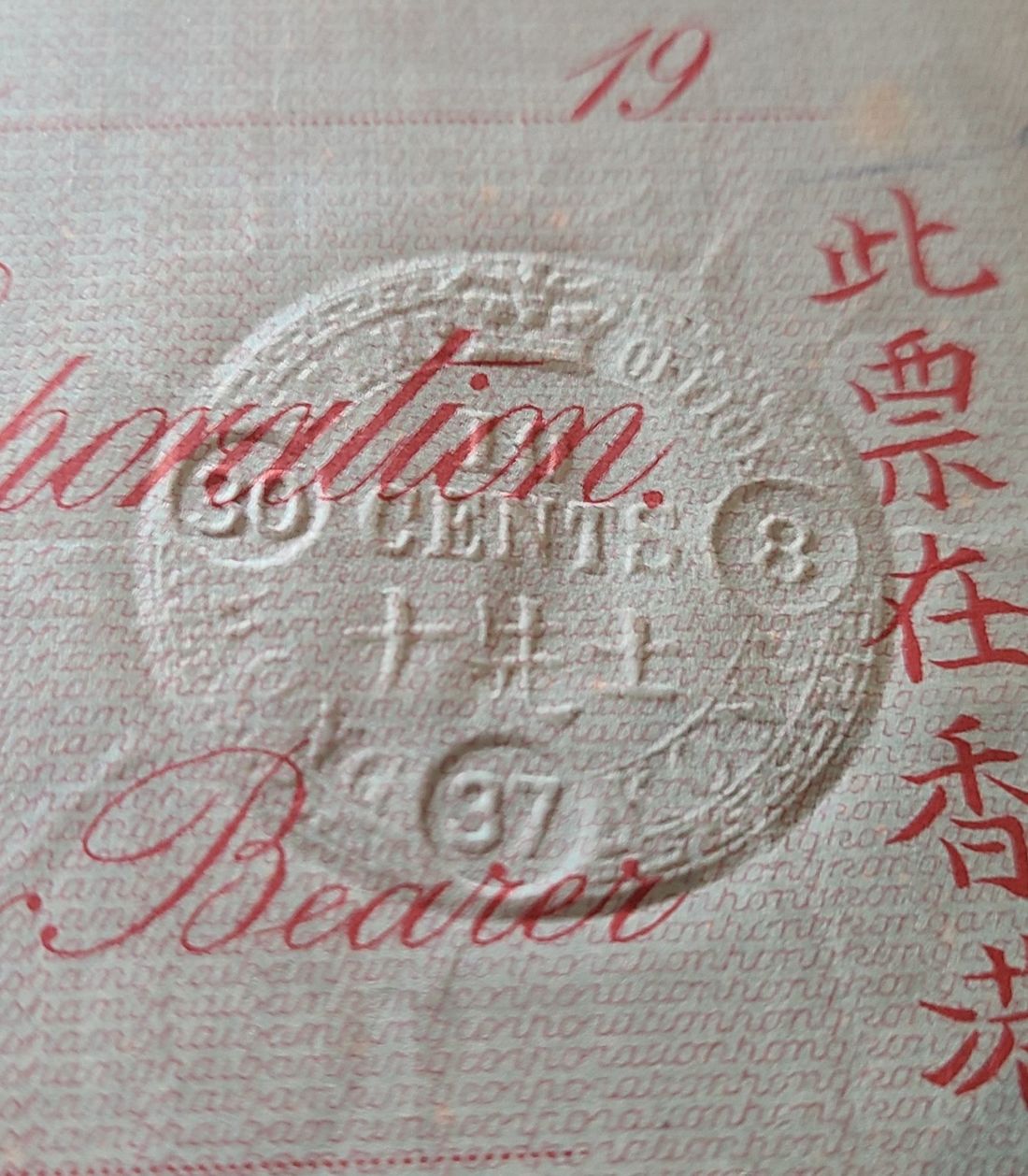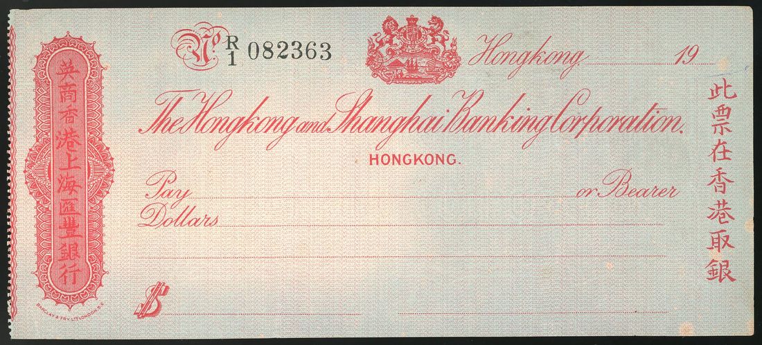 1937 a cheque from The Hongkong and Shanghai Banking Corporation Limited, serial number R/1-082363, brand new and unused, with steel seal of the Ten Cents.