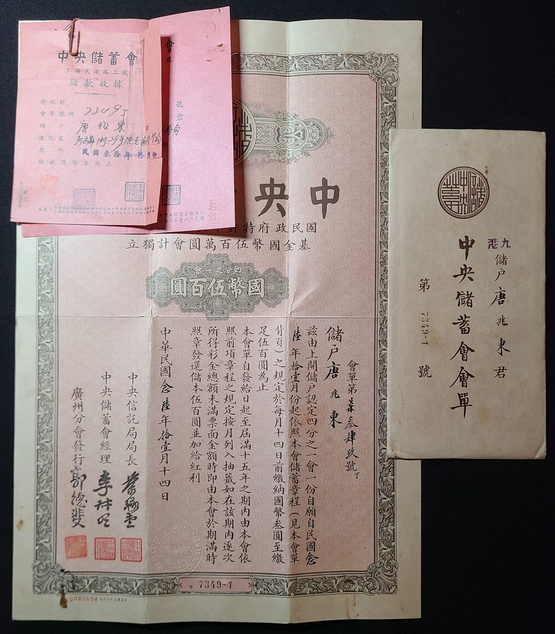 1937年 (民國二十六年) 中央信託局中央儲蓄會國幣伍百國証書, 及納款收據連原裝信封. 儲戶是香港居民, 收款地點是香港收款處.