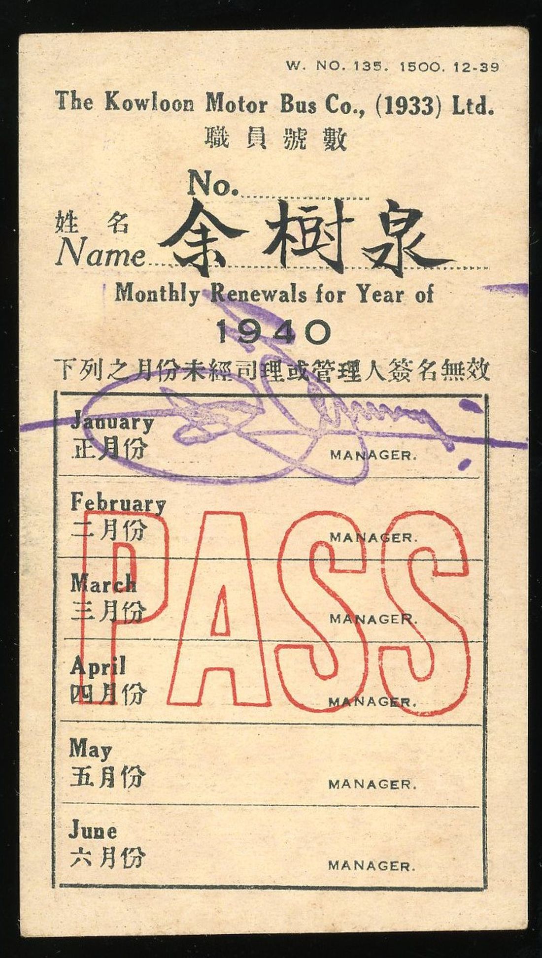 1940 Kowloon Motor Bus Company one-year staff pass. Good condition.