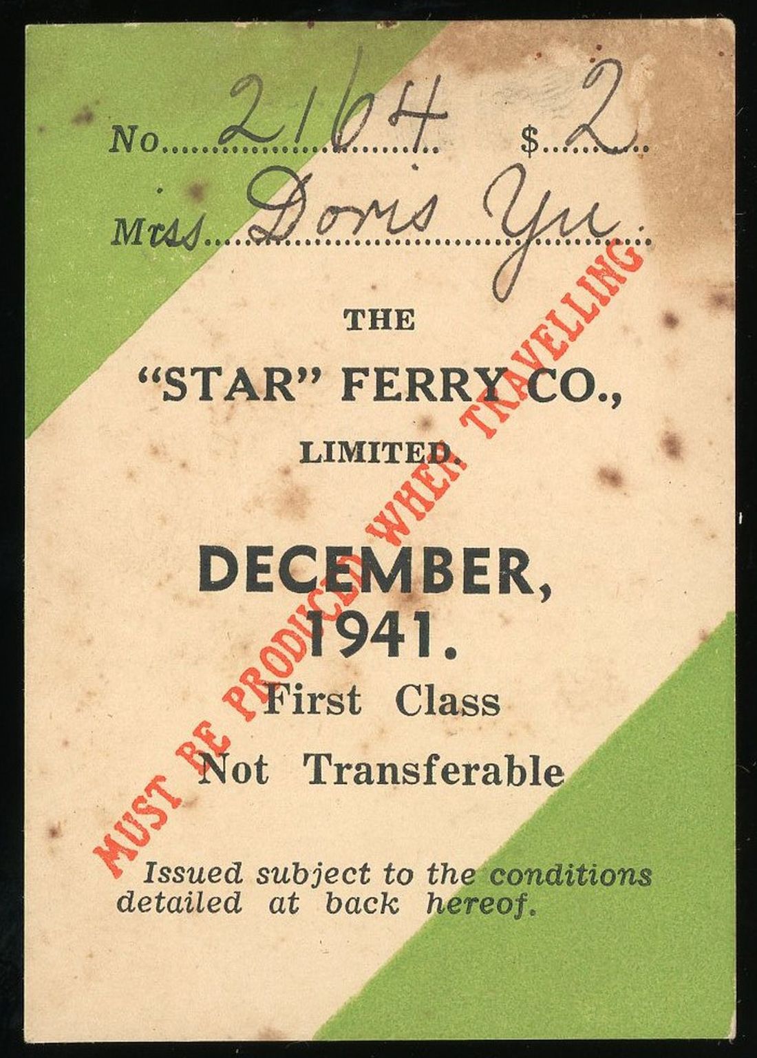 1941年12月份香港天星小輪頭等月票, 值得注意是1941年12月25日正是香港淪陷給日本的日子. 此故, 這枚月票淪陷後是否能繼續使用. 那就不得而知了.