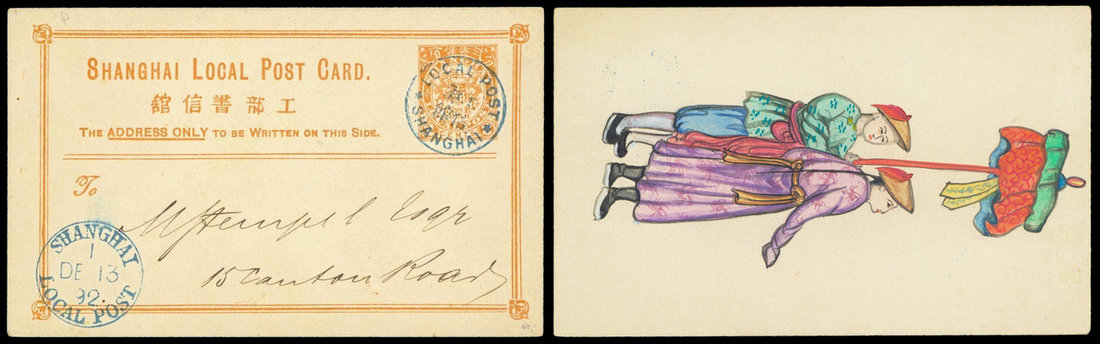 1892 (13 Dec.) Double Dragon 2c. stationery card to Shanghai local, cancelled by bilingual "Shanghai Local Post" chop in blue, showing "Shanghai/ Local Post/ I" arrival c.d.s. in blue at bottom left, handpainted illustration on reverse, very fine. Photo