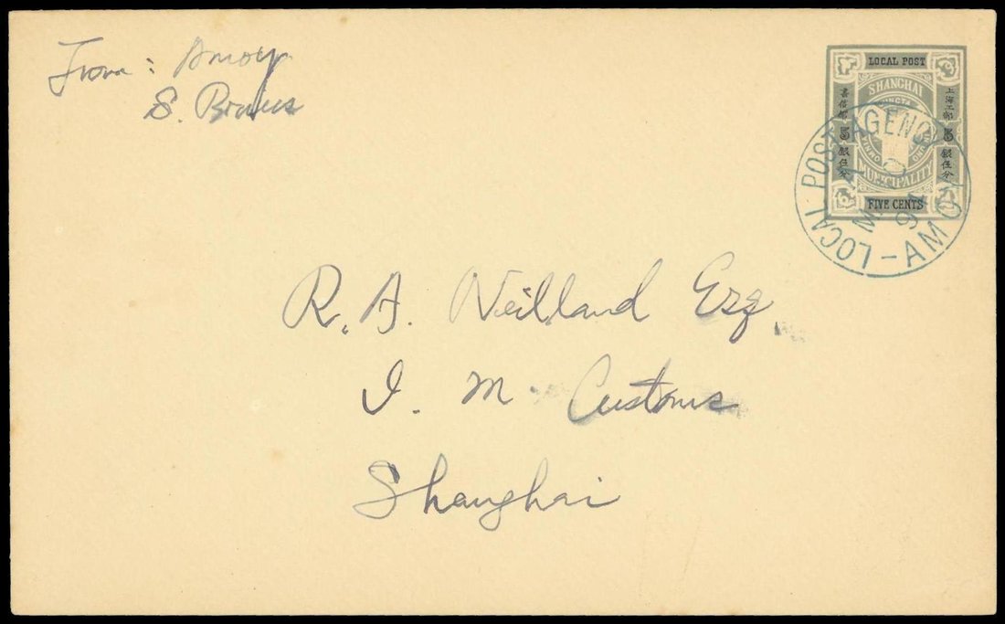 1894 (10 Mar.) Coat of Arms 5c. stationery envelope from Amoy Agency to Shanghai, cancelled by "Amoy Local Post Agency/ A" c.d.s. in blue, neat and very fine. Photo