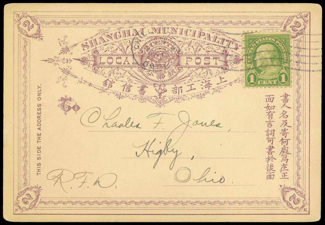 1901 Coat of Arms 2c. lilac stationery card used aboard, franked with USA Washington 1c. apple green, tied by 'Ohio' machine roller cancel, sent to local, fine. Photo