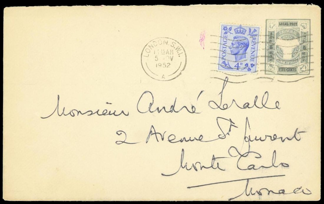 1952 (5 Nov.) Coat of Arms 5c. gray stationery envelope used aboard, franked with GB 4d. blue, cancelled by "London" wave roller machine cancel, sent to France, fine. Photo