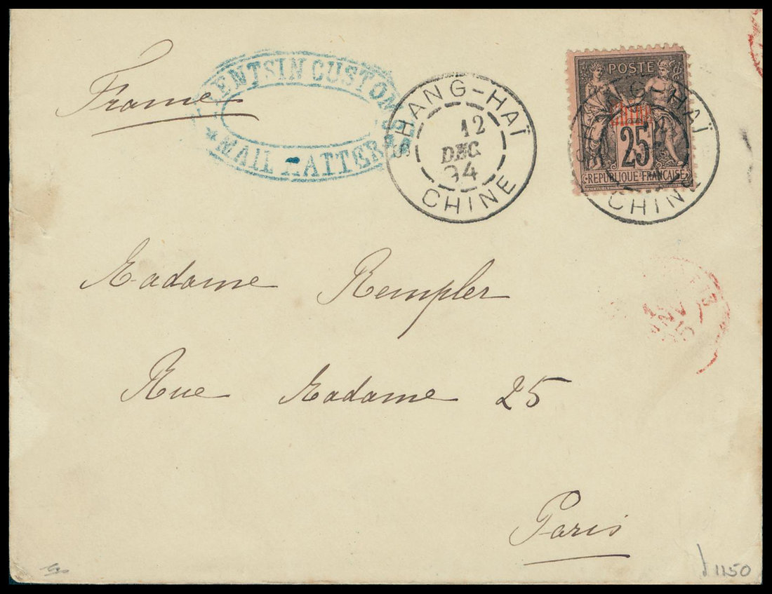 1894 (5 Dec.) envelope to Paris (1895), showing "Tientsin Customs/Mail Matter" oval h.s. (type II) in blue, matching "Customs/Tientsin" origin and blue "Customs/Shanghai" transit (9.12) double-ring d.s. on reverse, and bearing on front France "Chine" 25c., cancelled by "Shang-hai/Chine" c.d.s. (12.12), with faint arrival d.s. in red adjacent, very fine. Photo