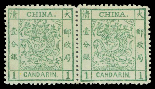 1ca. green horizontal pair, mint with pristine original gum, left stamp showing broken outer frameline at left, very fine and fresh, appealing. Chan 1. Photo