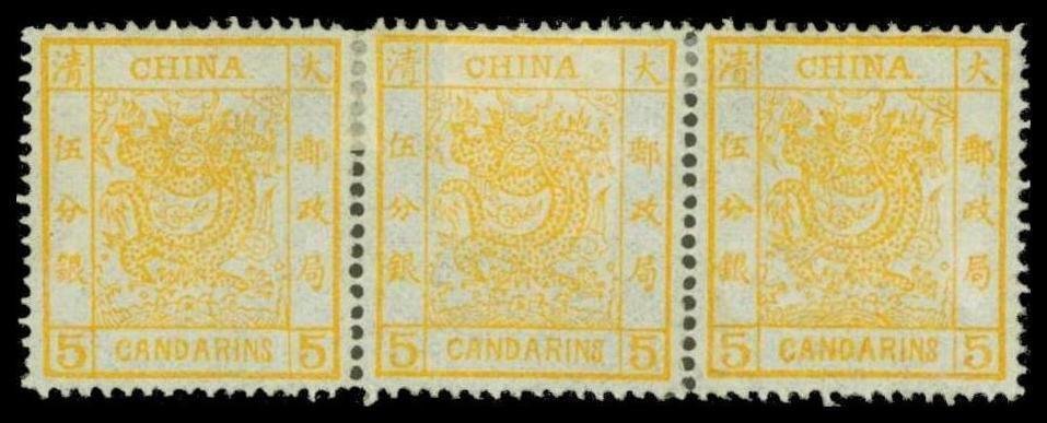 5ca. yellow, horizontal strip of three, mint with large part original gum, middle stamp hinged, some split perfs. reinforced, still very attractive. Chan 3. Photo