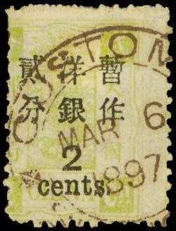 2c. on 2ca. dull yellow-green, variety basic stamp misplaced to left, cancelled by customs c.d.s. of "Mar 6 1897", an early date, fine. Chan 58 var. Photo