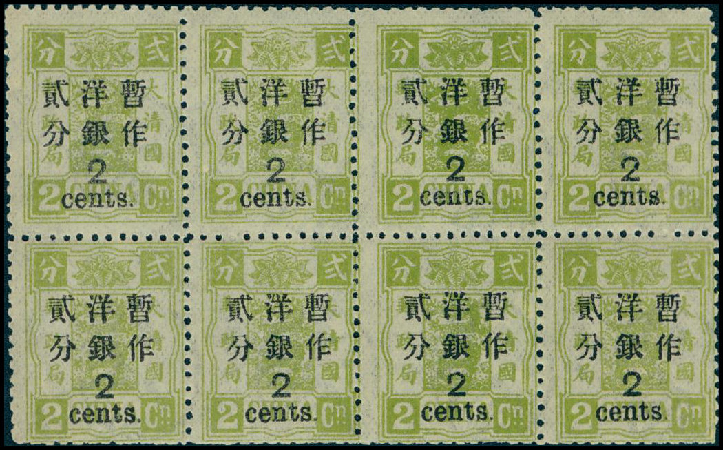 2c. on 2ca. yellow green block of eight, unmounted mint, fresh and very fine. Chan 83. Photo