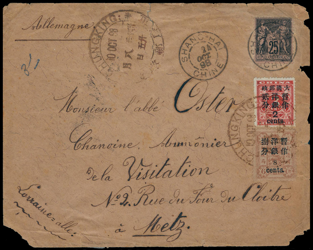 1898 (10 Oct.) envelope to Metz (27.11) bearing small figures surcharge on Dowager 1st printing 8c. on 6ca. and Red Revenue large figures surcharge 2c. on 3c., cancelled by "Chungking" origin dollar chop ("Shanghai" transit dollar chop (22.10) on reverse), in combination with France 25c., cancelled by "Shang-hai/Chine" c.d.s. (24.10), envelope slight soiling. R.P.S.L. certificate (2006). Photo