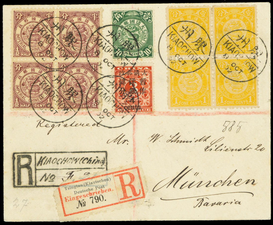 1902 (8 Oct.) envelope registered to Munich bearing Large Figure 4c. on 3c. [23] with I.C.P. ½c. and 1c. blocks of four plus C.I.P. 10c. cancelled by Kiaochow bilingual c.d.s. with the associated registration handstamp at foot partly covered by German Post Office Tsingtau registration label; the reverse with Kiaochow 20pf. and 5pf. tied by Tsingtau c.d.s. with two arrival c.d.s. alongside (one in blue). A fresh and colourful franking. Hwa number 581. Photo