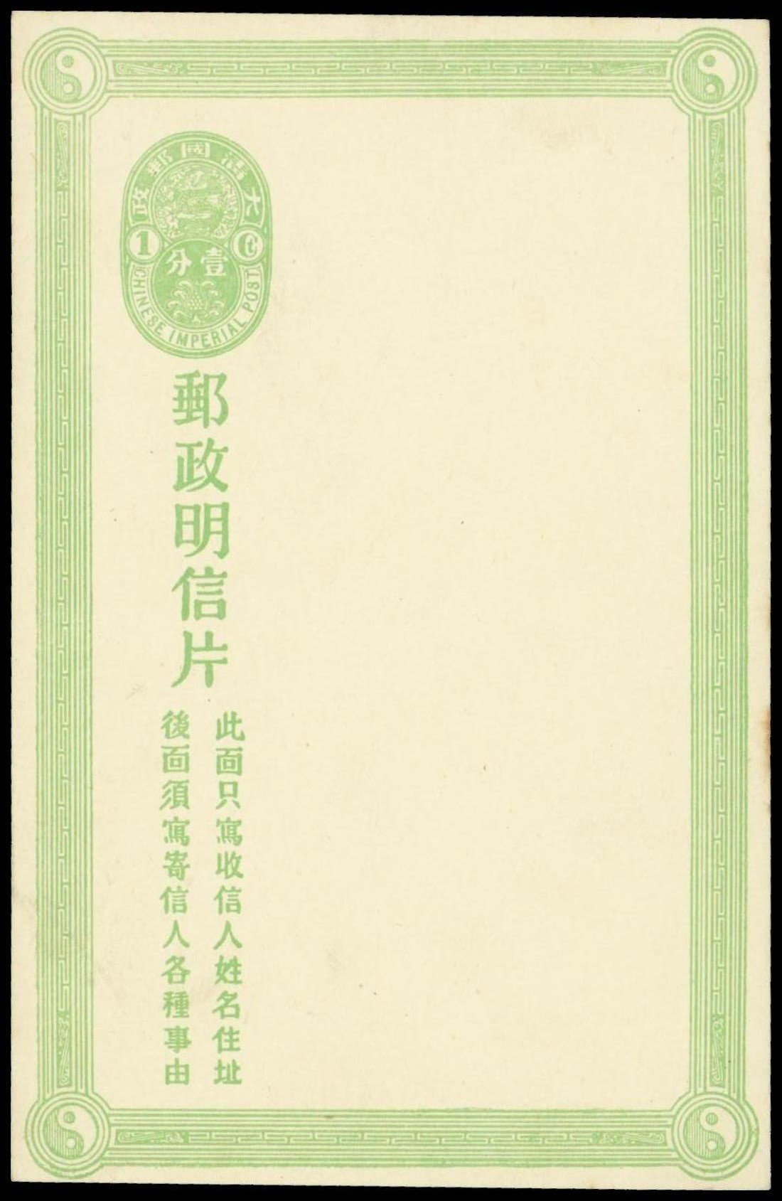 C.I.P. vertical format 1c. green stationery card (119.5mm. frame) with beautiful handpainted illustration on reverse, unused, very fine. Photo
