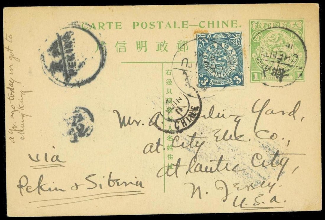 1911 (18 May) C.I.P. horizontal format 1c. green stationery card to U.S.A, via Peking and Siberia, bearing C.I.P. 3c., cancelled by "Chengtu" bilingual c.d.s., fine. Photo.