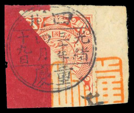 Chungking Provisional bisect 2c. red (cut diagonally from top left to lower right) used on piece, tied by full strike of double- ring "Szechwan/ Kuang Hsu 30th year, 4th month, 19th day/Chungking" d.s. (2 June 1904), fine used and rare . Chan 136B. Photo